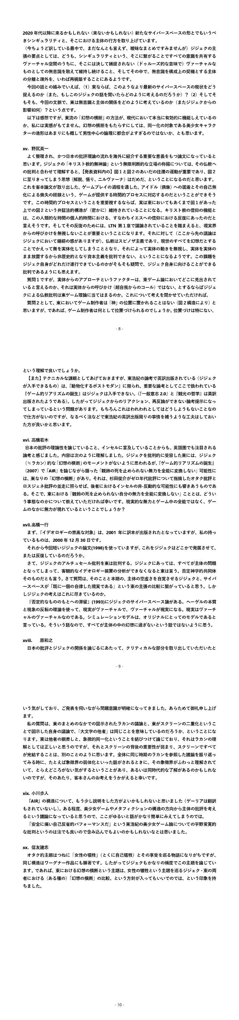 第二発表の客本発表では、1990年代におけるジジェクのサイバースペース論を対象とし、ジジェクのサイバースペース論が日本の批評家の東浩紀のサイバースペース論に積極的な影響を与えていることを指摘した。ジジェクと東は、いわゆる「ポストモダン」的な歴史状況を認識しつつも、単に複数に分裂する主体ではない主体像を提示するという点で、共通点があった。