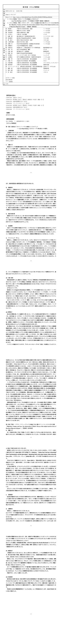 萩原一馬氏(大阪大学人文学研究科)の発表は、ハンナ・アーレントの人権論の鍵概念である〈諸権利を持つ権利〉を保証するものとして、これまでの研究では見過ごされてきたアーレントの連邦論に光を当てるものであった。萩原氏はアーレントの著作の丹念な読解に基づきつつ、国家の領域を超えた人類規模での合意に基づく国際法の領域に、〈諸権利を持つ権利〉の具体的保証を見出す。萩原氏の研究はアーレント解釈に新たに法哲学的展開をもたらす斬新なものであるだけでなく、諸国家を超えた共同体の形成というますます切実となりつつある政治的課題への理論的示唆を与えるものでもあった。